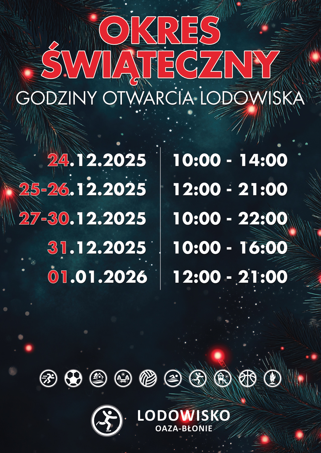 Lodowisko OAZA - Błonie to miejsce idealnego wypoczynku i świetnej zabawy dla całych rodzin czy grup przyjaciół. Zapraszamy wszystkich chętnych do rozpoczęcia swojej przygody z łyżwiarstwem lub jej kontynuacji na Kórnickich Błoniach.