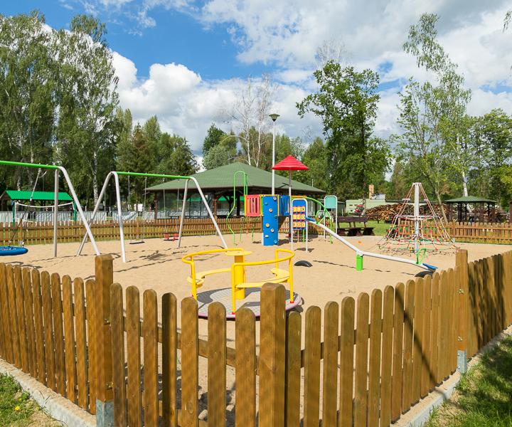 Plac zabaw jest ogrodzony niewysokim drewnianym płotem. Podłoże składa się z piachu. W środku znajduje się między innymi zjeżdżalnia, huśtawka, ścianka oraz siatka wspinaczkowa...