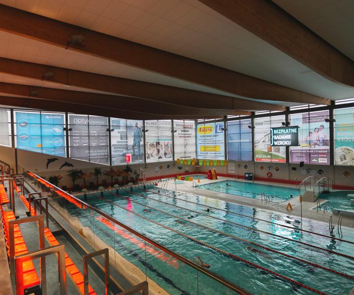 Oferta dotyczy emisji reklam na nowoczesnym ekranie LED mieszczącym się w centralnym punkcie hali basenowej. Dzięki dynamicznej i kolorowej emisji, spoty reklamowe łatwo pozostają zauważane przez klientów naszego Centrum (basen – ok. 600 osób dziennie). Ekran o powierzchni 10 m2, pozwala na wyświetlaniu prostych statycznych plansz reklamowych jak również zaawansowanych produkcji filmowych. Standardowa długość spotu wynosi 25 sekund, powtarzanego wielokrotnie w ciągu dnia. Emisja reklamy następuje codziennie w godzinach 7.00 - 22.00 na hali basenowej średnio co 10 minut.